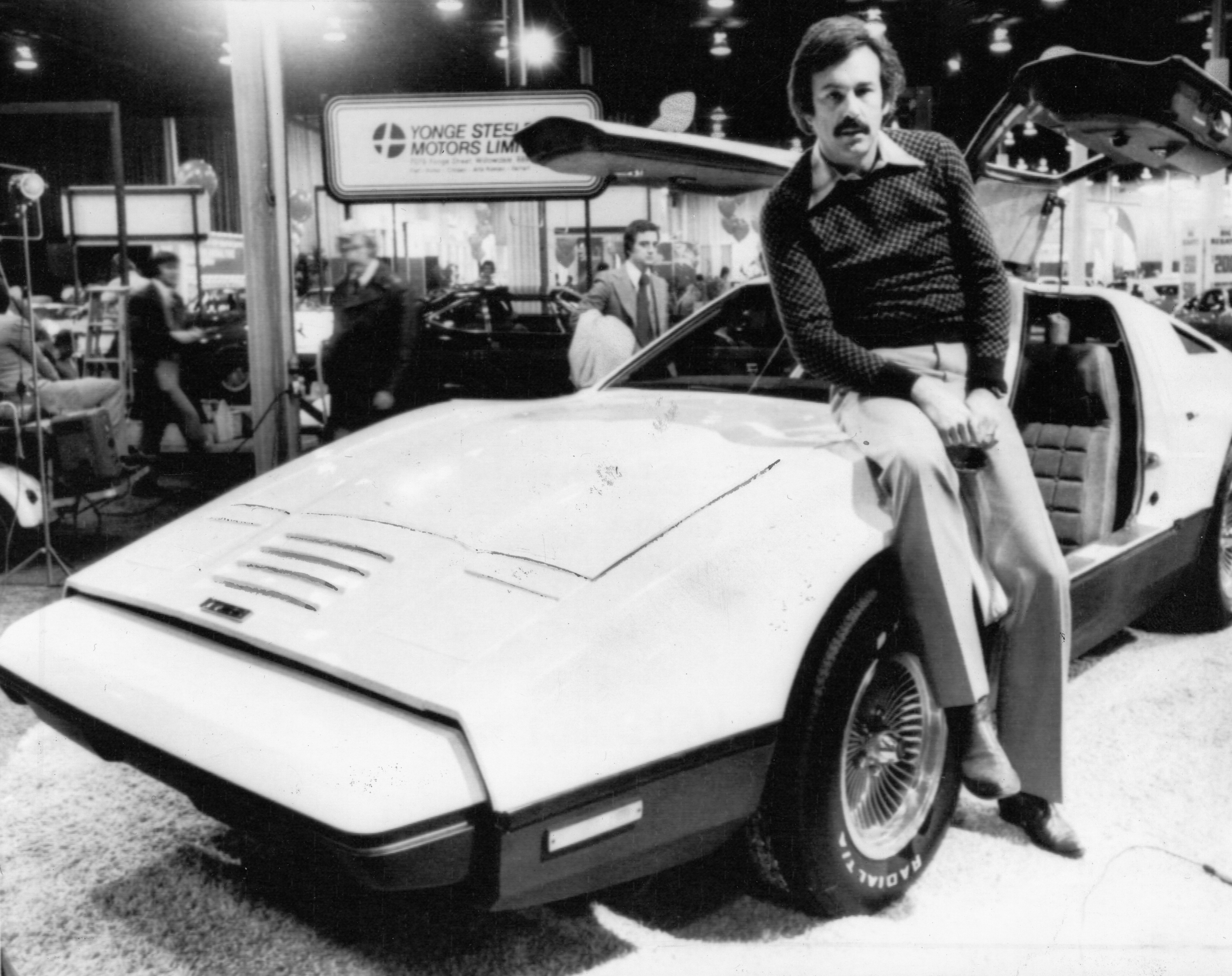 Malcolm Bricklin poses with his gull-winged sports car, the Bricklin SV1, during the Toronto International Auto Show in Toronto, June 24, 1975.Hamilton Spectator
