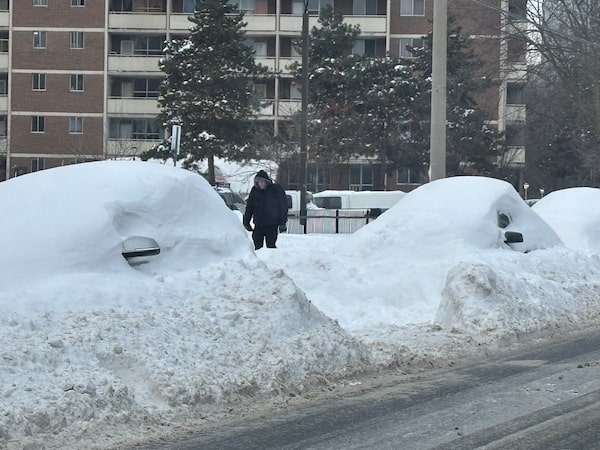 Cars parked on a street on Tuesday near Andrew Clark's house in Toronto, two days after a record snowfall hit the city.Andrew Clark/The Globe and Mail