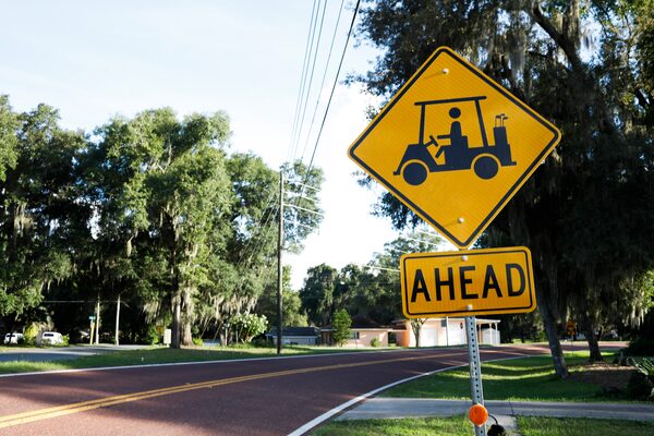 Drivers are reminded to watch for people using “low-speed vehicles” in the Villages, a retirement community in Sumter County, Fla., June 30, 2019.EVE EDELHEIT/The New York Times News Service