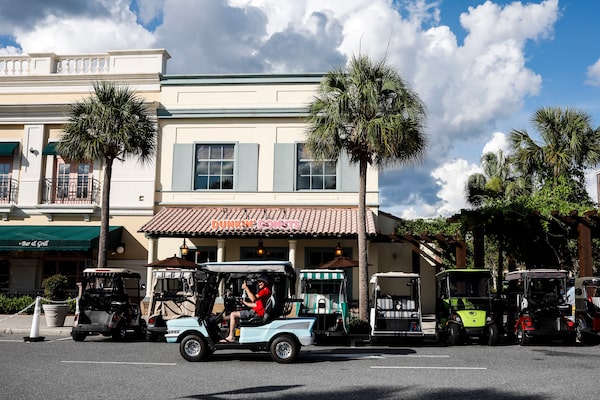 Golf carts line Spanish Springs Town Square in the Villages, a retirement community in Sumter County, Fla., June 30, 2019. Some 60,000 carts ply the neighborhoods, which are laid out so the roughly 120,000 residents can meet all their shopping, medical and entertainment needs without a full-size vehicle.EVE EDELHEIT/The New York Times News Service