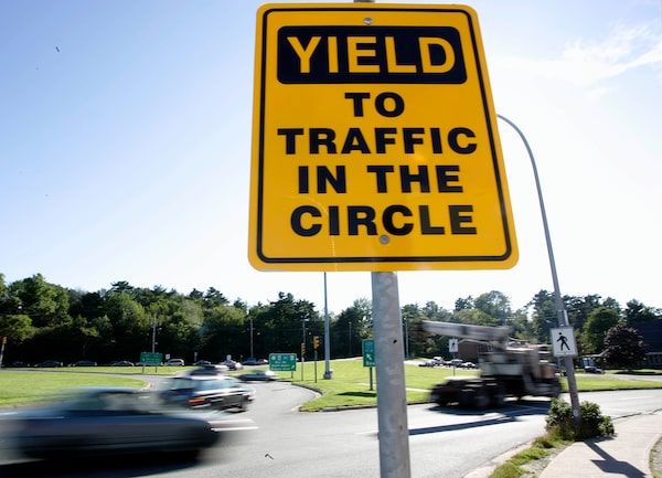 A new traffic sign informs afternoon rush hour commuters to yield to traffic inside a traffic circle in Halifax.Paul Darrow/The Globe and Mail