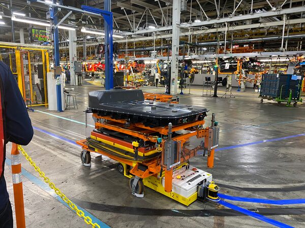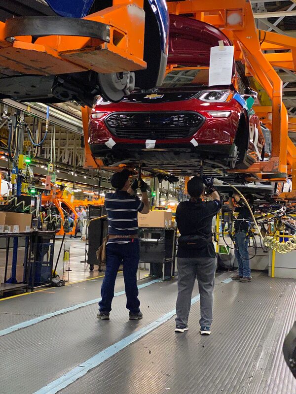 Then an eerily-silent automated electric cart sped across the floor to deliver a battery for the next car on the line – an all-electric Chevy Bolt.