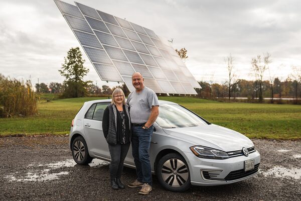 Andrew and Debbie Spadzinski with their 2017 e-Golf, in front of the solar panel that helps power their home. As an electrical contractor, Mr. Spadzinski also has an elaborate geothermal home heating system.Courtesy Matt Spadzinski