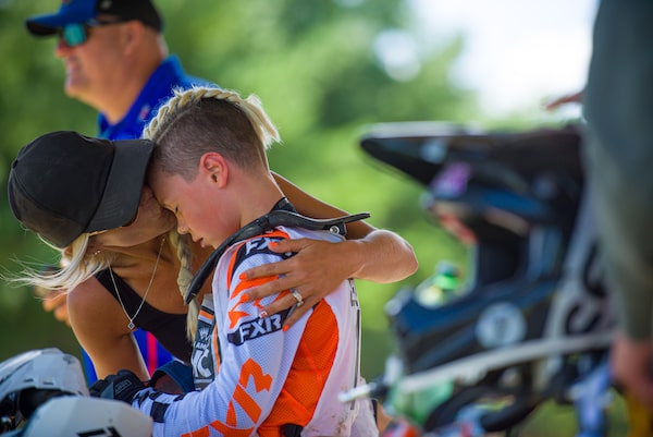 Braxton Zeitner, the 65 cc GP winner, with his mother, at the Walton Raceway. Race organizers say they’ve seen participation in motocross roughly double since the start of the COVID-19 pandemic.James Lissimore/The Globe and Mail