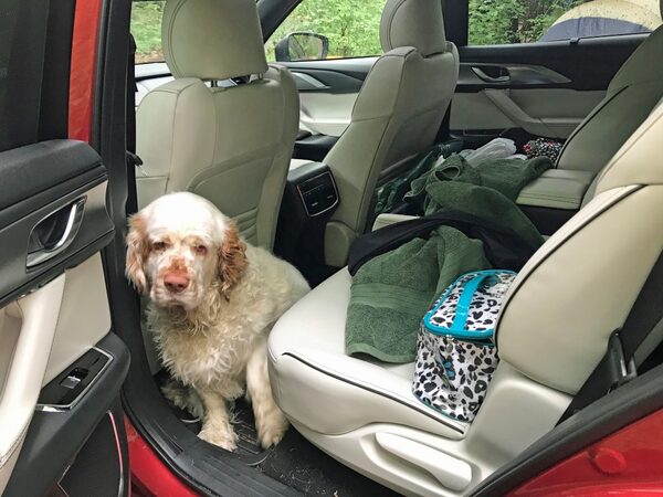 The front seats were very comfortable – a lot more comfortable than our camping chairs. It rained on both afternoons of our visit, and since our tent leaked and most of the indoor facilities at the park were closed because of COVID-19 restrictions, we took to sitting in the Mazda to wait out the storms. Elvis sat them out, too, in his footwell behind the driver.