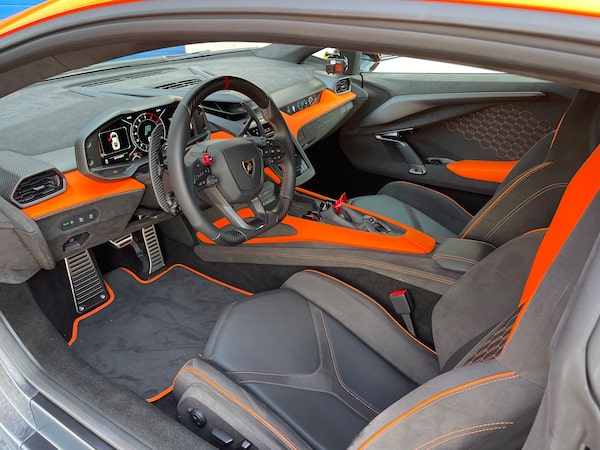 The Revuelto retains the sleek, aerodynamic silhouette of past Lamborghinis. It has the brand’s signature Y-shaped lights at the front and rear, sharp-edged side fins behind the front wheel arches, side air intakes and an active rear wing. The longitudinal engine is fully exposed and double hexagonal exhaust pipes at the rear give it a menacing look. Four hundred exterior colours are available, but the iconic Arancio, or orange, is my favourite.