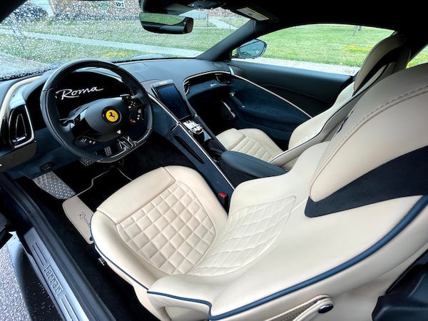 Open the Roma’s door and you’re invited into a sumptuous cabin separated into two separate single-seat pods. It’s like sitting in a speed boat, with the wraparound cockpit and an endless hood stretching out in front of you. The quilted leather seats are wide and flat, no doubt made with larger North American behinds in mind. The absence of aggressive bolsters is a clue that this car is intended as more of a grand-tourer, unlike Ferraris high-strung midengine cars or one of its V12-powered hellions.
