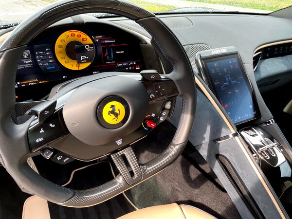 The infotainment system is Ferrari’s newest, and it’s impressive to look at but comes with a steep learning curve. There is a lot going on. Every inch of the driver’s screen is customizable, and, once mastered, the touchpad controls on the steering wheel can perform pretty much any task. Saying “ciao, Ferrari” brings up a voice assistant. There are three display screens in total, including one in front of the passenger. In use, the system can be slightly sluggish to react, and the steering wheel touchpads are too-easily pressed accidentally.