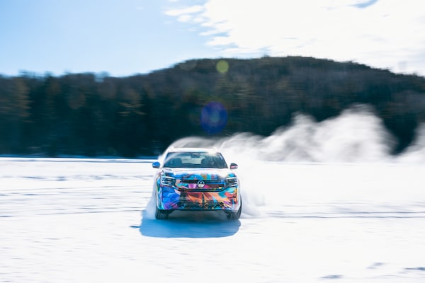 A camouflage Volkswagen Atlas Prototype drifting on the ice in Quebec.Jordan Lenssen/Courtesy of manufacturer