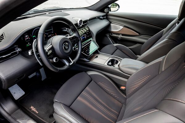 Although we’re driving preproduction versions of the Folgore, the attention to detail in the passenger cabin is clear to see. The two doors open super-wide to make it as easy as possible to enter. The visibility is improved over the previous GranTurismo, the result of a higher windshield and slimmer A-pillars that have been repositioned.