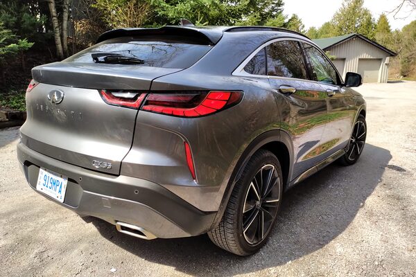 The QX55's sloping roofline give the vehicle a distinct coupe-SUV profile.Emily Atkins/The Globe and Mail