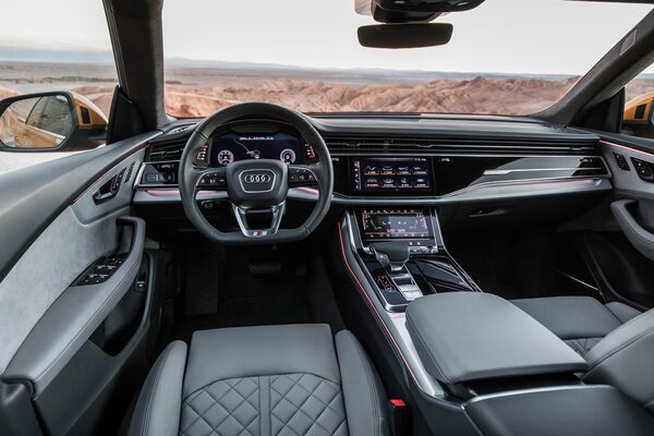 If the new Audi looks oddly familiar, it’s because it shares an architecture and rough dimensions with Lamborghini’s Urus. The Q8 has the same stout proportions. It looks enormously wide on the road, bursting out of its lane.