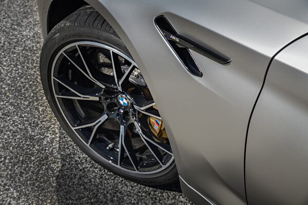 It appears slightly more menacing than the base M5, lower and angrier. The Competition model distinguishes itself with glossy black exterior trim and kidney grilles. The lightweight forged alloy wheels save around 3 kilograms per corner.