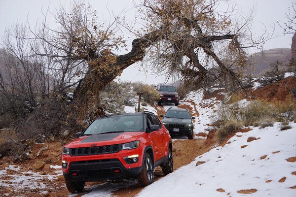 Beyond that, the Renegade (not present in Moab) and the Compass are the least optimized for off-roading. There are no differential locks, and their so-called active drive low transmission is a bit of a misnomer. This isn’t a two-speed transfer case; instead, the junior-most Trailhawks have a shorter final drive ratio, which – combined with the wide ratio spread of the nine-speed autobox – results in an unusually low 20.4:1 first-gear “crawl” ratio (most other CUVs are in the 15–17:1 range).