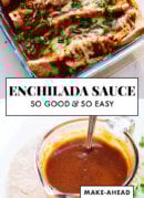 Storage suggestions: Extra enchilada sauce will keep well in the refrigerator for up to 5 days. Or, freeze it for up to 3 months. Let it cool to room temperature before transferring to a wide-mouth mason jar, leaving some room at the top for expansion (don’t screw on the lid completely until the mixture is fully frozen), or a freezer bag (remove excess air before sealing).