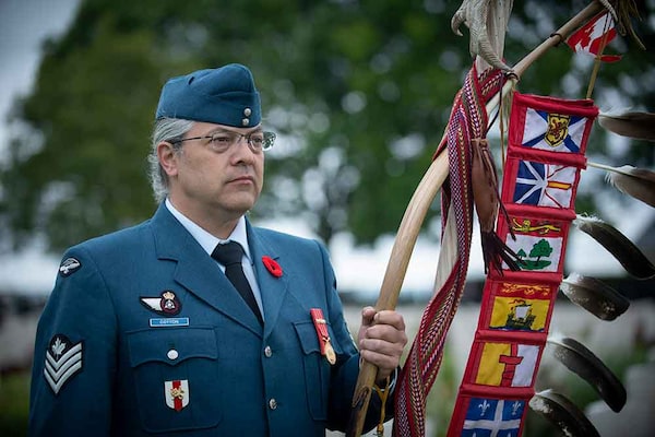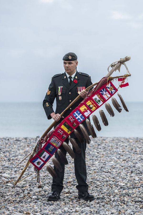 Sergeant Moogly Tetrault-Hamel during the Indigenous Sunrise ceremony in Dieppe, France. There is a long tradition of Indigenous participation in Canada’s military.The Globe and Mail