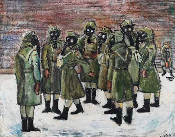 Gas Drill, by Canadian artist Molly Lamb Bobak, the country’s only female official war artist during the Second World War, depicts women engaging in a gas-mask drill.Canadian War Museum (CWM 19710261-1603)
