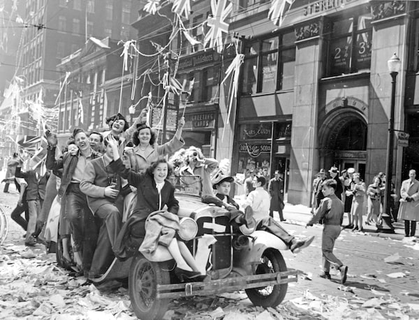 People celebrate the news of Germany's surrender on Bay Street in Toronto on May 7, 1945.The Globe and Mail
