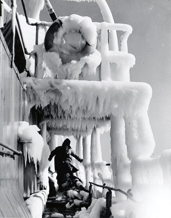 A Canadian warship encased in ice. In the Battle of the Atlantic, sailors faced harsh seas, frigid weather conditions and a relentless enemy.Canadian War Museum (CWM 19910238-796)