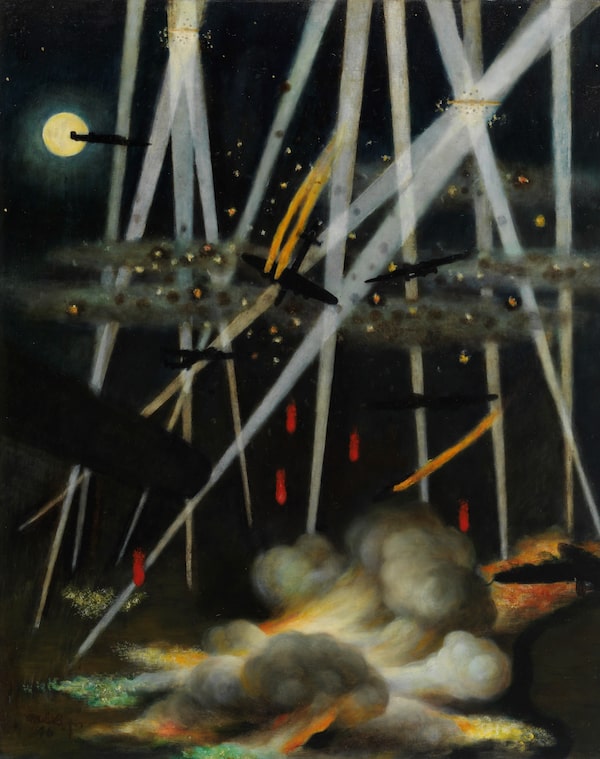 Night Target, Germany, by Canadian artist Miller Brittain, a Royal Canadian Air Force airman in Bomber Command, shows the stunning beauty and brutality of a bomber strike against European targets.Canadian War Museum (CWM 19710261-1436)