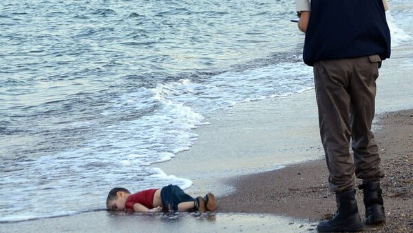 A Turkish police officer stands next to a migrant child's dead body off the shores in Bodrum, southern Turkey, on September 2, 2015 after a boat carrying refugees sank while reaching the Greek island of Kos.