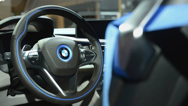 The steering wheel trim matches the light blue of the seat belts of a BMW i8.Fred Lum/The Globe and Mail