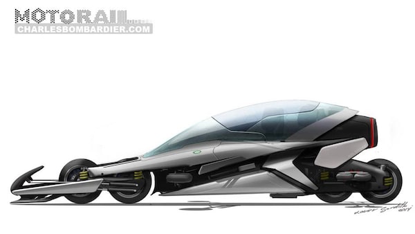 The Motorail is an electric motorcycle concept equipped with four inline in-wheel motors. It was designed to run inside a concrete track at speeds exceeding 350 mph. It can also ride on normal roads and highways with its built-in gyroscopic balancing system.