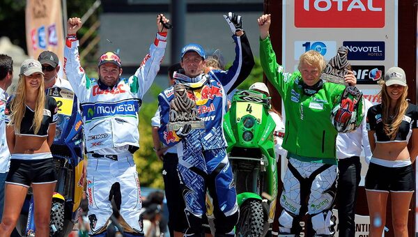 French biker Cyril Despres (C), winner of the 2010 Dakar Rally moto category, celebrates with Pal Anders Ullevalseter of Norway (R) and Francisco Lopez Contardo of Chile at the podium in Buenos Aires on January 17, 2010.ALEJANDRO PAGNI/AFP / Getty Images