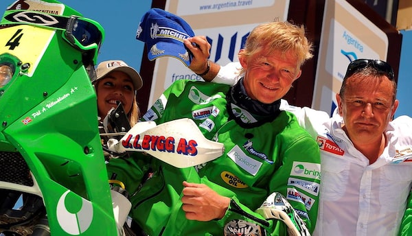 Norway's biker Anders Ullevalseter celebrates with Dakar Director Etienne Lavigne (R) on the podium of the Dakar 2010, in Buenos Aires, Argentina on January 17, 2010. France's Cyril Despres won the Dakar 2010 ahead of Norway's Pal Anders Ullevalseter and Chile's Fransisco Lopez Contardo.GABRIEL BOUYS/AFP / Getty Images