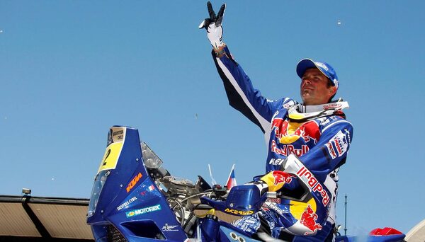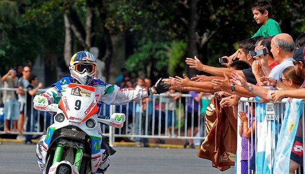 Chilean driver Francisco Lopez Contardo on his Aprilla, greets fans upon arrival to Park Ferme and getting the third place of the 2010 Dakar Rally in Buenos Aires on January 16, 2010.ALEJANDRO PAGNI/AFP / Getty Images