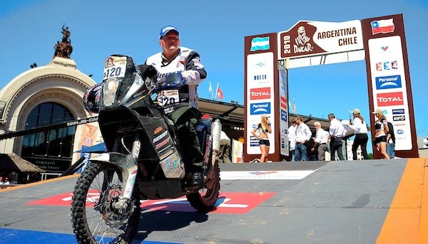 The last biker in the final placings for the 2010 Dakar Rally, France's Christian Califano, rides his motorbike on the podium in Buenos Aires, Argentina, on January 17, 2010. Frenchman Cyril Despres won his third Dakar Rally motorcycling title, ahead of Norway's Pal Anders Ullevalseter and Chile's Fransisco Lopez Contardo.GABRIEL BOUYS/AFP / Getty Images