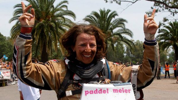 Christina Meier of Germany celebrates after crossing the finish line of the fourteenth stage of the 2nd South American edition of the Dakar Rally 2010 in Buenos Aires, January 16, 2010.JACKY NAEGELEN