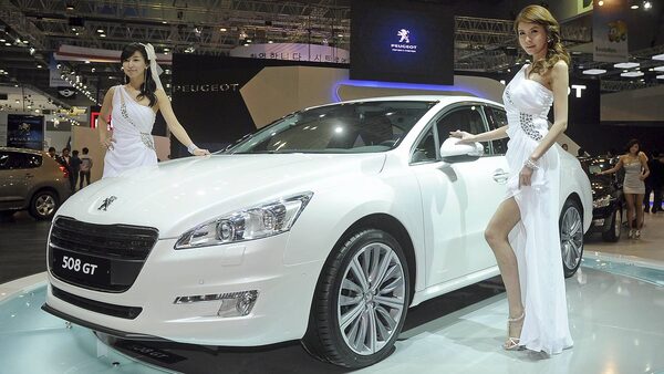 South Korean models pose with a Peugeot 508GT HDi car during a press preview of the Seoul Motor Show in Goyang, north of Seoul on March 31, 2011.JUNG YEON-JE