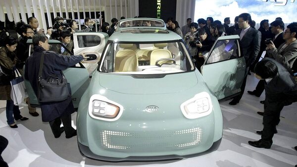 Visitors look at South Korea's Kia Motors's concept car KND-6 during a press unveiling at the Seoul Motor Show in Goyang, South Korea, Thursday, March 31, 2011.Ahn Young-joon