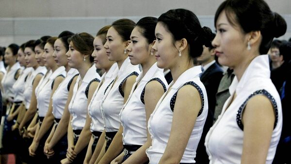 South Korean models stand in line during the Seoul Motor Show in Goyang, South Korea, Thursday, March 31, 2011.Ahn Young-joon
