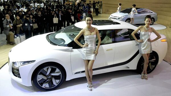 Visitors look around cars at the Seoul Motor Show in Goyang, South Korea, Thursday, March 31, 2011.Ahn Young-joon