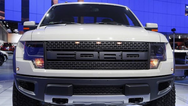 View of the grille and headlights of a 2014 Ford SVT Raptor on display during the press preview day of the North American International Auto Show in Detroit, Michigan January 14, 2014.REBECCA COOK/Reuters