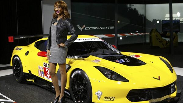 Model and product specialist Alicia Amie poses next to the Chevrolet C7.R Corvette Stingray during the press preview day of the North American International Auto Show in Detroit, Michigan January 14, 2014.REBECCA COOK/Reuters