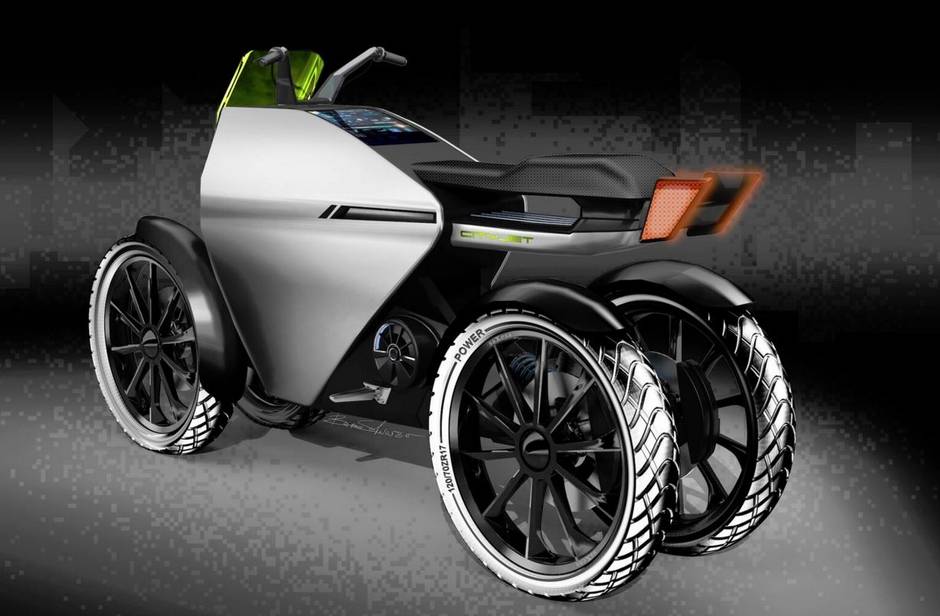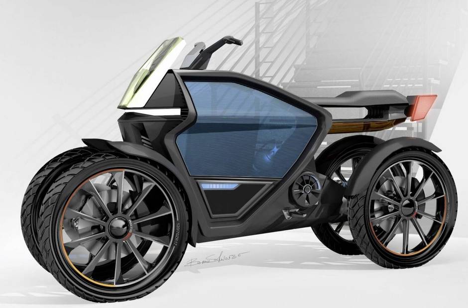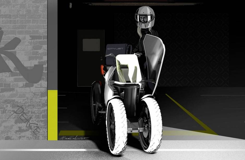 The CityJet is a 4WD scooter with a narrow stance designed as an alternative to cars in cities. It would be powered by a compact fuel cell burning clean hydrogen, and it would feature side panels for additional protection from weather and impact.