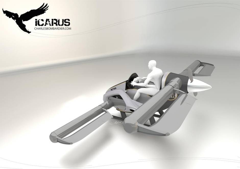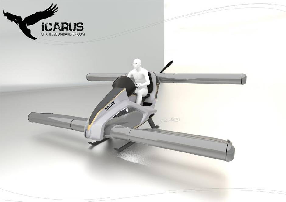 The Icarus is a wingless flying powersport aircraft concept that drives like a motorcycle and uses the magnus effect to fly. It is equipped with a modified Rotax 914 engine to provide power to four rotating cylinders for lift and a rear propeller for propulsion.