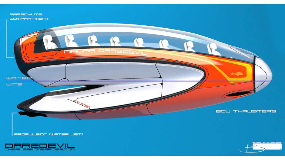 The Daredevil is a thrill ride boat designed to take the plunge over Niagara Falls with eight people on board. A drag anchor chute would slow it down, and safety features would include shock-absorbing bumpers.