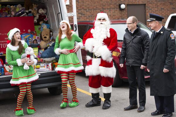 Santa and elves Laura Brien, left, and Emily Hoey, laugh as they arrive with Philipp Witzendorff, Mercedes-Benz Canada vice-president and Head of Toronto Retail Operations, 2nd right, to deliver toys for the Toronto Fire Fighters Toy Drive to Toronto Fire Chief Jim Sales, right, in Toronto on Friday December 18, 2015. 2015.J.P. MOCZULSKI/The Globe and Mail