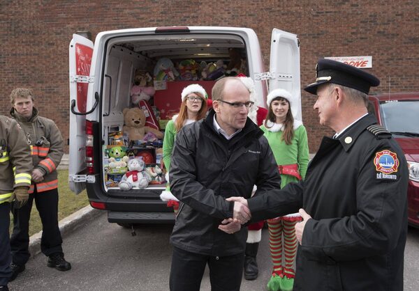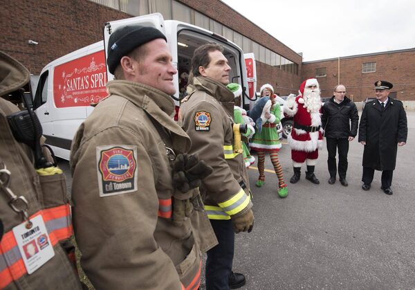 Santa arrives with elves (L-R) Emily Hoey and Laura Brien and Philipp v. Witzendorff, Mercedes-Benz Canada Vice President and Head of Toronto Retail Operations, left, to deliver toys for the Toronto Fire Fighters Toy Drive to Toronto Fire Chief Jim Sales, right, in Toronto on Friday December 18, 2015. 2015.J.P. MOCZULSKI/The Globe and Mail