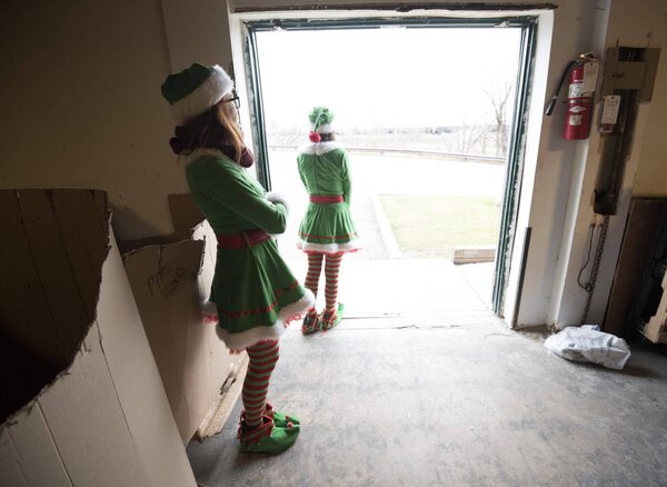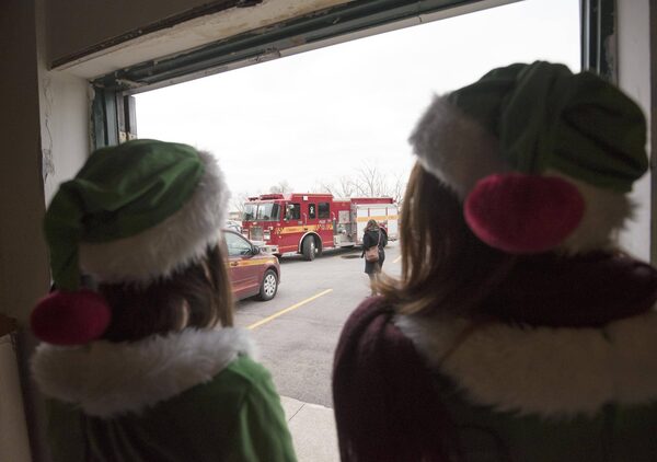 Elves Laura Brien, leftt, and Emily Hoey await the arrival of Santa in the Mercedes Sprinter convoy delivering toys to the Toronto Fire Fighters Toy Drive in Toronto on Friday December 18, 2015. 2015.J.P. MOCZULSKI/The Globe and Mail