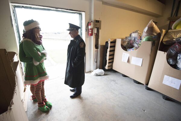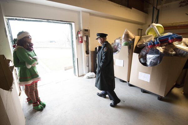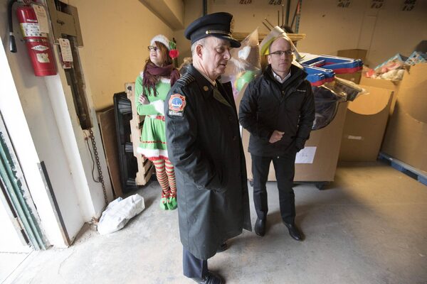 Toronto Fire Chief Jim Sales walks past a crate bursting with toys as elf Emily Hoey awaits the arrival of Santa in the Mercedes Sprinter convoy delivering toys to the Toronto Fire Fighters Toy Drive in Toronto on Friday December 18, 2015. 2015.J.P. MOCZULSKI/The Globe and Mail