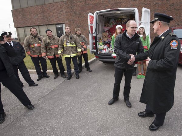 Santa shakes hands with Toronto Fire Chief Jim Sales as he and elves (L-R) Emily Hoey and Laura Brien arrive with Philipp v. Witzendorff, Mercedes-Benz Canada Vice President and Head of Toronto Retail Operations, right, to deliver toys for the Toronto Fire Fighters Toy Drive to Toronto Fire Chief Jim Sales, right, in Toronto on Friday December 18, 2015. 2015.J.P. MOCZULSKI/The Globe and Mail