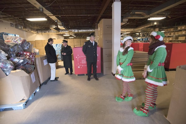 Toronto Fire Firefighters association President Frank Ramagnano, left rear, chats with Chief Jim Sales as Elves Elves Laura Brien, left, and Emily Hoey, wait for Santa to arrive at the a warehouse full of toys in the Mercedes Sprinter convoy delivering toys to the Toronto Fire Fighters Toy Drive in Toronto on Friday December 18, 2015. 2015.J.P. MOCZULSKI/The Globe and Mail