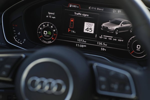 The dashboard of an Audi A4 is seen during a demonstration of Audi's vehicle-to-infrastructure technology Tuesday, Dec. 6, 2016, in Las Vegas. The technology allows vehicles to "read" red lights ahead and tell the driver how long it'll be before the signal turns green. For the driver, the system puts a traffic signal icon on the dashboard telling how many seconds the light will remain red.John Locher/The Associated Press