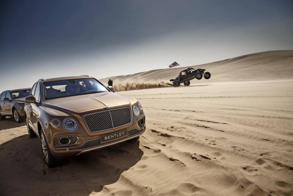 Back at the Imperial Dunes, a stranger in a buggy with a large American flag flying proud above its roof roars across the horizon before popping a wheelie. His all-black dune buggy is gorgeous. Mint condition. It has a nitro injected V-8 from a Corvette, the driver says. He knows about the Bentayga; back home he’d been invited to a preview of the car. The flagpole on the roof was lit up with blue LED lights, and on the back of the buggy it says “Smokin’.” It was a Monday morning. “This is real one-per center stuff here!” he said gleefully, before popping another wheelie.