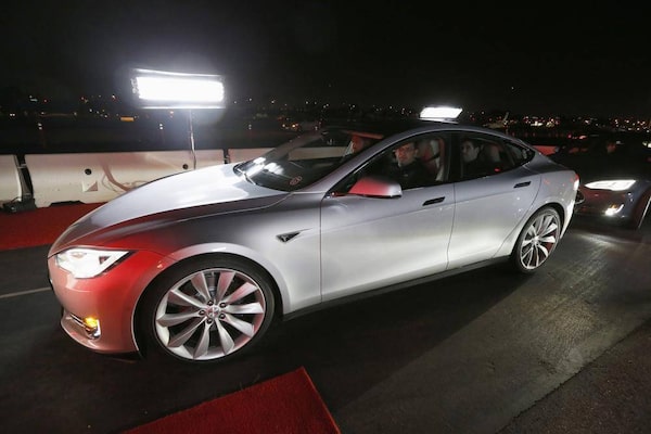 New all-wheel-drive versions of the Tesla Model S car are lined up for test drives in Hawthorne, California October 9, 2014. Tesla Motors Inc on Thursday took its first step toward automated driving, unveiling features that will allow its electric sedan to park itself and sense dangerous situations.LUCY NICHOLSON/Reuters